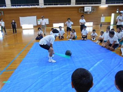 2人目の6年生はシートの真ん中までたどり着き、えいやっ!