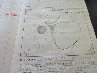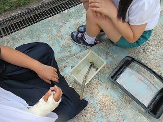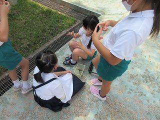3年生は、理科の学習で、トンボの育ち方を学習しています。トンボも、モンシロチョウと同じようにさなぎになるのかを観察しています。今日は、トンボの幼虫(ヤゴ)がはいっている水そうの水替えをしました。