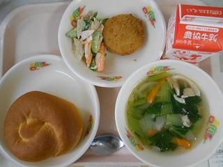米キャロットパン、ハムとチーズのフライ、ごぼうサラダ、ファイバースープ米