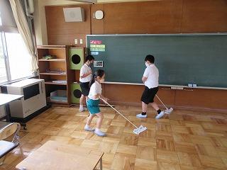 そうじは、同学年で行わず、異学年のグループで行っています。特に1年生は、上級生のそうじの仕方をしっかり見ながら覚えて頑張っています。