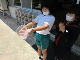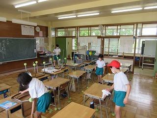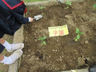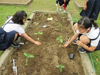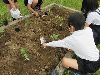 ②3年生は、3限目の理科の時間にヒマワリの苗の植えかえをしました。3年生は、4月18日に、ヒマワリ、オクラ、ピーマン、ホウセンカの4種類のたねをまきました。4種類のたね全てから、子葉がでました。そのうち、ヒマワリの苗の植えかえをしました。ヒマワリがどれくらい成長するか楽しみにしながら植えかえをしました。