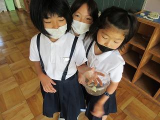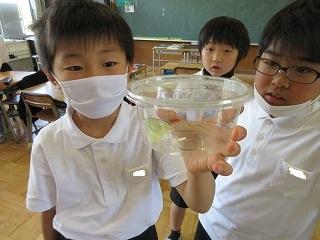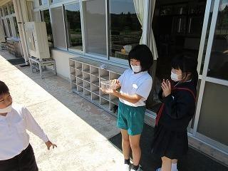 3年生は、理科でモンシロチョウを育てています。3年生は10人いますが、そのうちの一人が世話をしているモンシロチョウが羽化しました。今日は、2人目です。さなぎから出た後、液体も出てくるのに驚いていました。