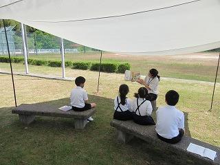 昼休みに、図書館司書の方に、外で読み聞かせをしていただきました。今日は、天気も良く、青空の下で新緑の木々を眺めながら、気持ちよく読み聞かせを聞くことができました。