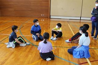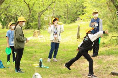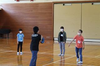 午前中は刈安小で、班ごとに自己紹介をした後にレクリエーションやドッジビー大会をしました。