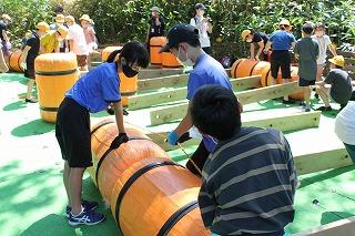 みんなで力を合わせて、必要な板や浮きなどを運び、いかだを組み立てます。
