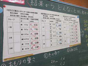 また、どのグループも、ふりこの長さを変えると、ふりこが1往復する時間は変わっていました。さらに1班と2班のグループのふりこの長さを変えたときの実験から、ふりこの長さが短ければ短いほど1往復する時間は短くなることがわかりました。