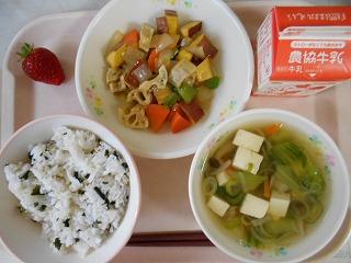 今日の献立は「わかめごはん、さつまいもとれんこんの黒酢あん、チンゲン菜のスープ、いちご」でした。