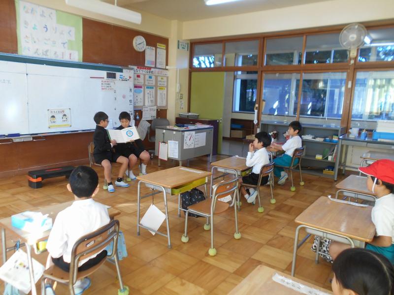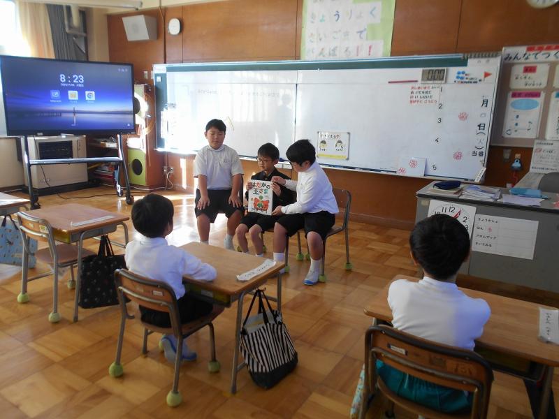 朝学習は「読書」です。今日は3年生が国語の学習「おすすめの1さつを決めよう」で、1年生が本をすきになってくれるような楽しい本を2冊選び、1年生教室に読み聞かせに行きました。ちょっとたどたどしい部分もありましたが、1年生は真剣に聞いてくれました。そして、感想もお話してくれました。1年生が楽しんでくれたようで、3年生も嬉しそうでした。