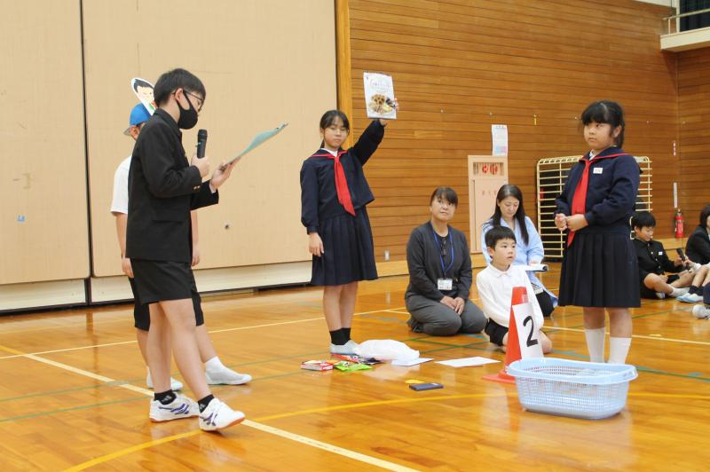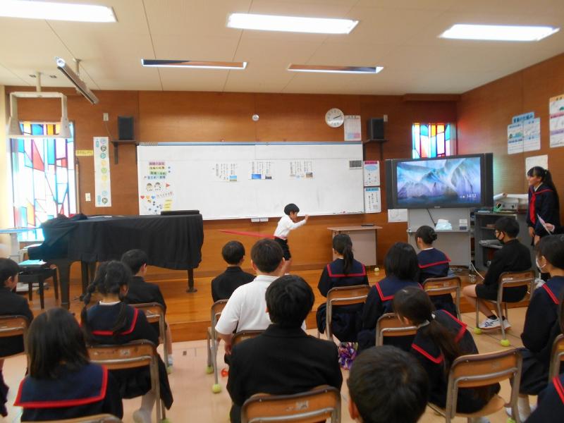 1年生は特技のフラフープを披露してくれました。1年生なのに、堂々と前に出て演技をしてすごい!大きな拍手が送られました。4・5年生のペアは習い事のチアダンスを披露してくれました。10月の今月の歌でもある「ハピネス」に合わせて堂々のダンス。大きく手を広げてステップもすてきでした。最後に6年生は、総合の学習で調べた中国の食べ物について発表してくれました。スライドを使って楽しく発表してくれました。