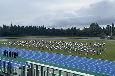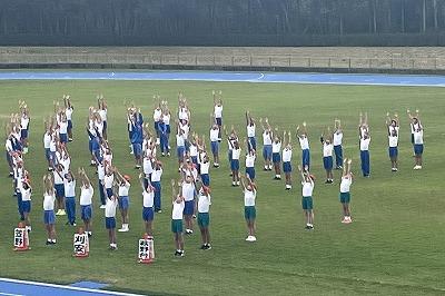 津幡町の小学校6年生が津幡運動公園陸上競技場に集まり、友好の輪を広げ、自己の体力を高めました。