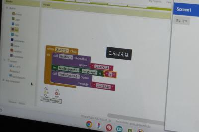自分でプログラミングした通りにタブレットから声が聞こえ、生徒から笑みがこぼれます。