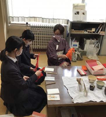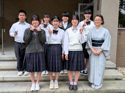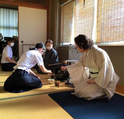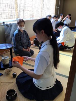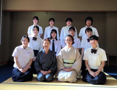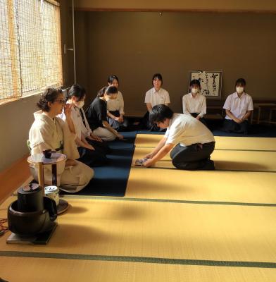 本校からは、部員7人、先生2人が参加し、茶道の先生のご指導のもと、お点前の練習や運ぶ練習等をしました。