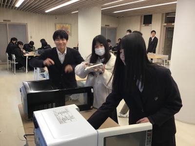 杜の鐘ホールに用意した電子レンジ。これで生徒のお弁当も体もホカホカに。午後の授業に向けパワーをチャージできたかな?