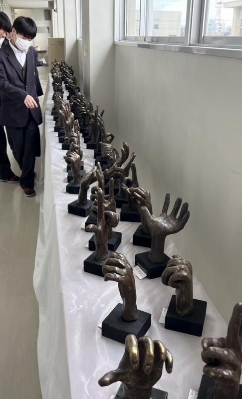 1年生美術選択者が授業で作った手の彫刻を、羽咋高校3階美術室前で展示しております。