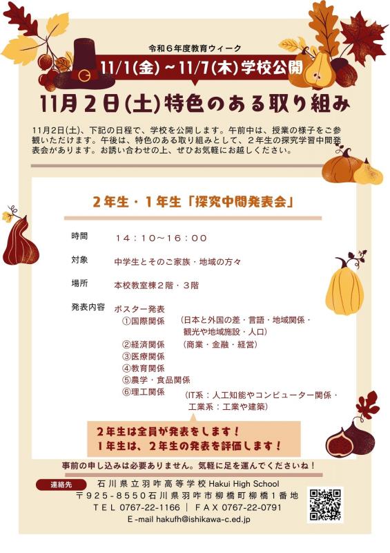 また、11/2(土)は、特色のある取り組みとして、2年生の探究活動の中間発表会が行われます。