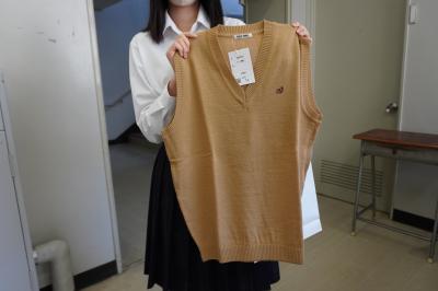 購入したキャメル色のベストを見せてくれました!胸には羽咋高校のイニシャルが刺繍されています。