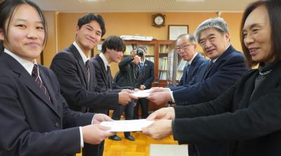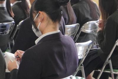 式では、前期生徒会長の木村 竜宇さんから「いただいたマスクで体調管理をしっかりし、受験勉強を頑張りたい。」と、感謝と決意の言葉が述べられました。