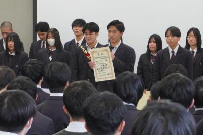 表彰伝達式では、県新人大会や北信越大会、各種コンクールなどで優秀な成績を収めた部活動から、入賞報告がありました。