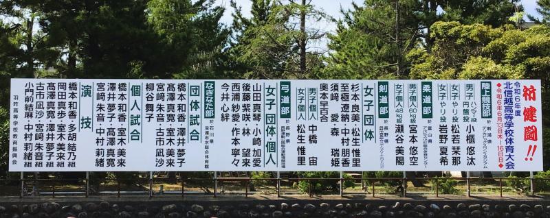 6月12日(水)7限目、第一体育館にて、13日~16日に開催されます北信越高等学校体育大会・中部日本大会壮行式が行われました。本校からは陸上競技部・柔道部・剣道部・弓道部・なぎなた部・卓球部が石川県代表選手として出場します。
