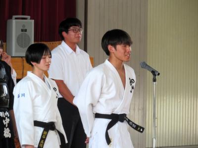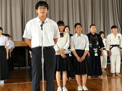 生徒を代表し、生徒会長 村井師隆さんは「北信越・中部大会への出場は、厳しい練習を重ね普段の努力を絶やさなかった結果です。大会では悔いの残らないよう全力で戦ってきてください。生徒一同応援しています。」とエールを贈りました。