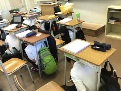 7月5日(金)4限目、授業中の地震発生を想定し、いざという時にすばやく反応するためにそれぞれの教室で「しゃがむ」「隠れる」「じっとする」の安全行動を実践しました。