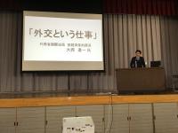 教育ウィーク初日の1日(水)は、1・2年生対象に「外交という仕事」のテーマで、外務省国際法局 前経済条約課長の大西進一氏をお迎えし講演会が開かれました。外国との交渉や日本の安全保障という責任あるお仕事をされている方の普段聞くことのできないお話を聞くことができ、生徒にとって広い視野を持って将来について考える良い機会となりました。