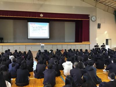 11月16日(木)7限目、2年生を対象に羽咋警察署生活安全課の山田氏と、石川県教育委員会学校指導課の山下氏を講師としてお招きし「非行防止教室」を開催いたしました。