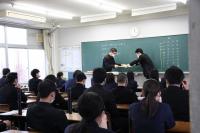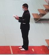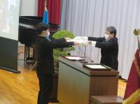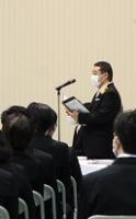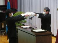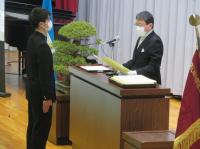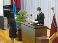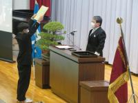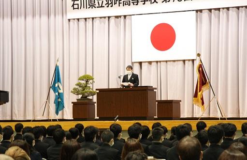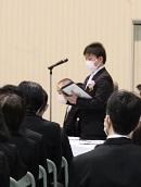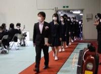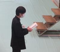 学校長式辞では、「新型コロナウイルス感染拡大により不安な日々が続いたが、粘り強く過ごした。4月からの新生活のスタートは、思うようなことが出来なかった1年を考えると、『再出発』という言葉がふさわしい。『再出発』とは、失ったものを取り戻すために、もう一度同じところに向かうのではなく新しい場所に向かって出発することである。『再(ふたたび)』という文字は『再生』『再挑戦』のようにここぞという場面で使われている。だからこそ、今日は、『再出発』という言葉を贈りたい。」と、学校長よりはなむけの言葉がありました。