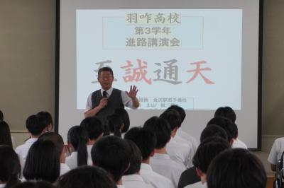 6月10日(火)、金沢駅西予備校の土山 樹一郎先生をお招きして、進路講演会が行われました。受験までのルーティンや避けるべきこと、また、勉強に集中できるようにクラス全体で教室環境を整え学校中心の学習を行う大切さを教わりました。