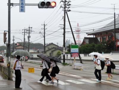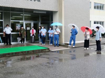 この活動は、県下一斉に行われるものです。当日は雨となりましたが、参加者は、生徒を見守り、明るい挨拶を交わしていました。