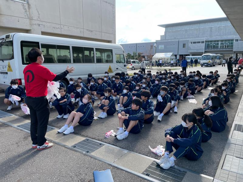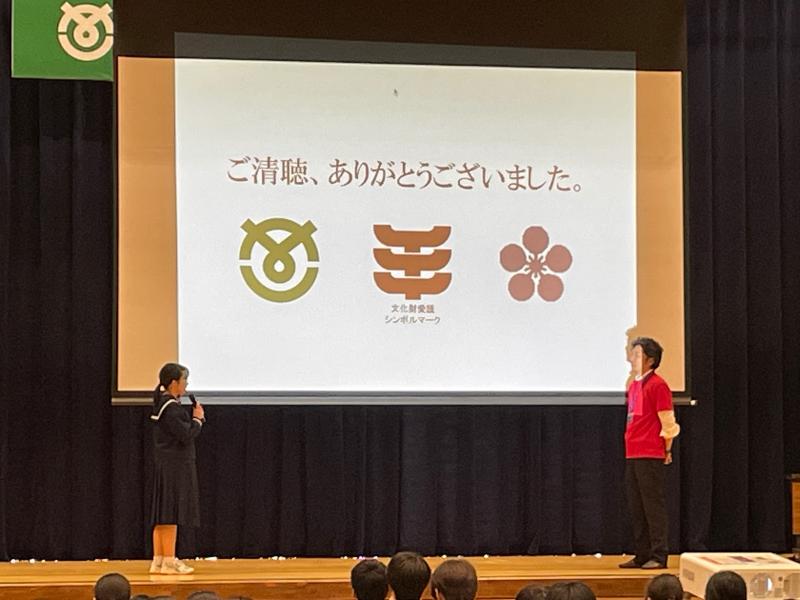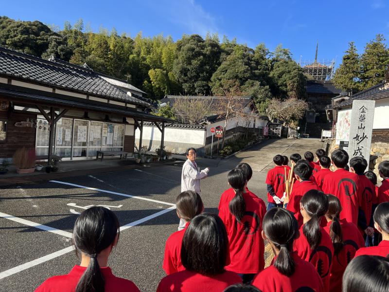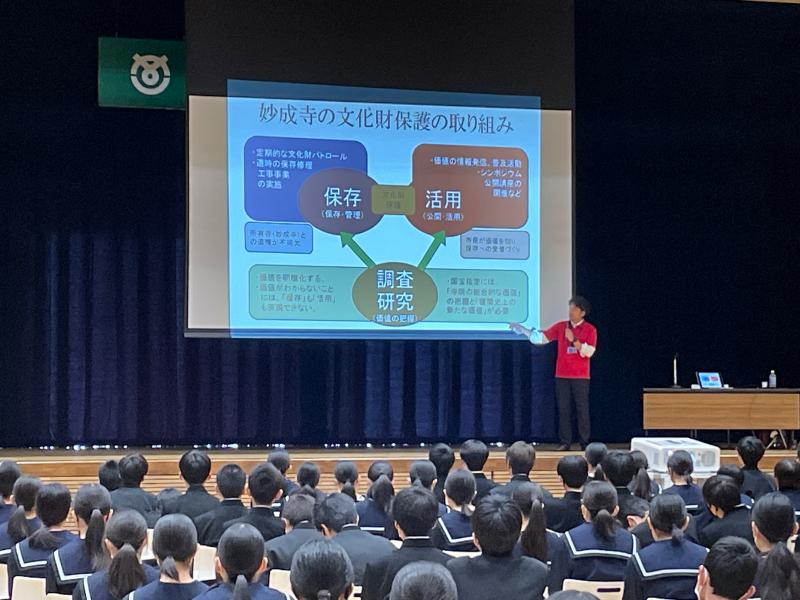 妙成寺の歴史や建物を分かりやすく解説していただくと共に、文化財を守り、後世に伝えていく意識をもつことが、文化財を未来につなぐことになることなど、中学生のもつべき視点を教えていただきました。最後に生徒会執行部2年生の中橋 心枝さんがお礼を述べて、講演会を終了しました。