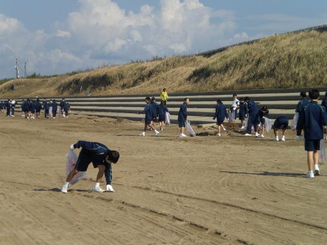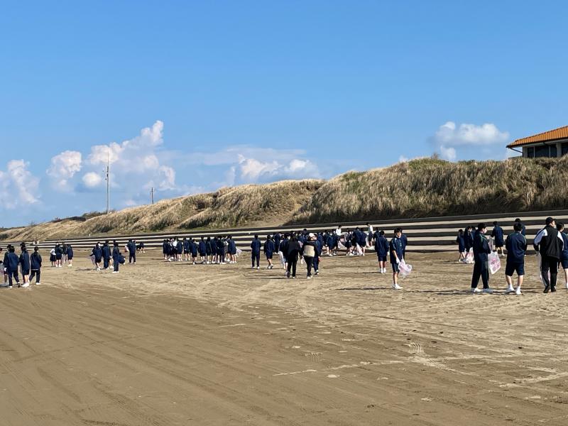 爽やかな秋晴れのもと、穏やかに凪いだ日本海を背にして、千里浜海岸を学年ごとに任されたエリアを一生懸命に清掃する生徒の姿がありました。2人で1枚のゴミ袋もあっという間に一杯になり、多量に打ち上げられたゴミを目の当たりにして、私たちの課題を再認識した生徒も多いのではないかと思います。