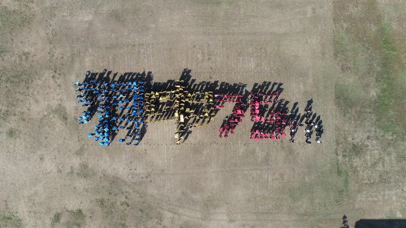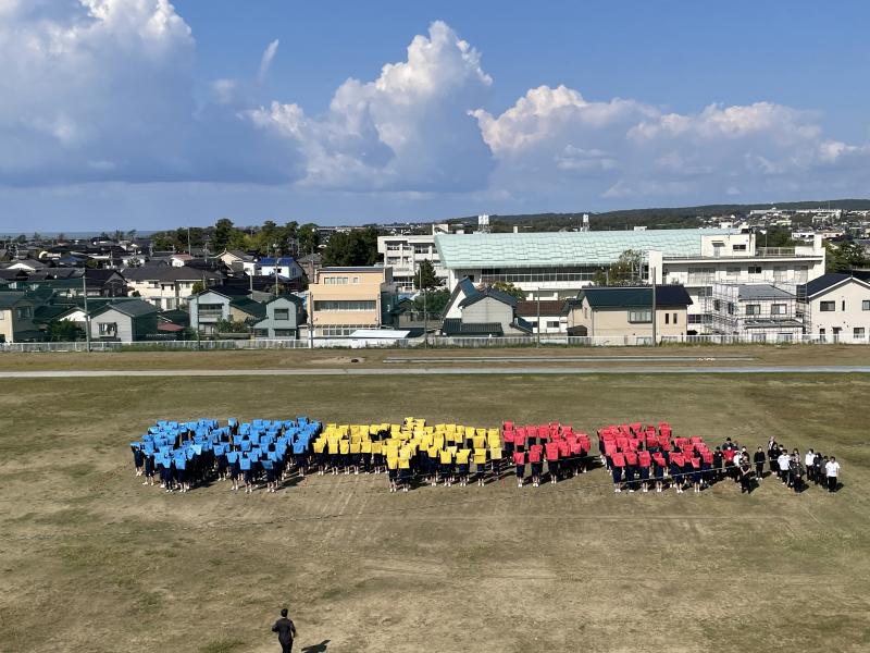 生徒と教職員による心に残る共同制作として、人文字に取り組みました。3年生は青色、1年生は黄色、2年生は赤色のバンダナを用いて 羽 中 75th の文字をグラウンドに描き、上空からドローンによる空撮を行いました。