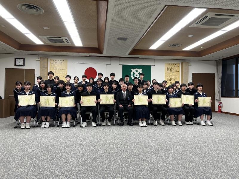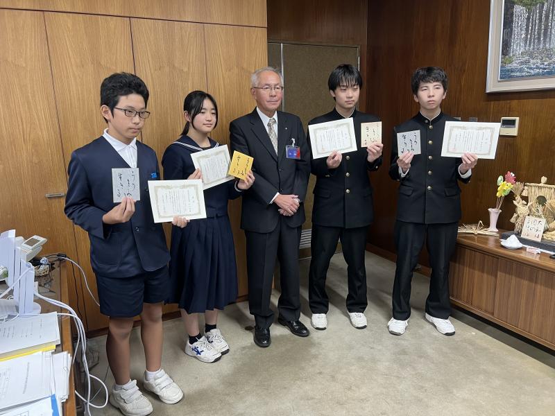19日(火)羽咋市役所で、英語検定及び漢字検定で優秀な成績を収めた羽咋中・邑知中の生徒に対して、八島教育長から賞状が授与されました。