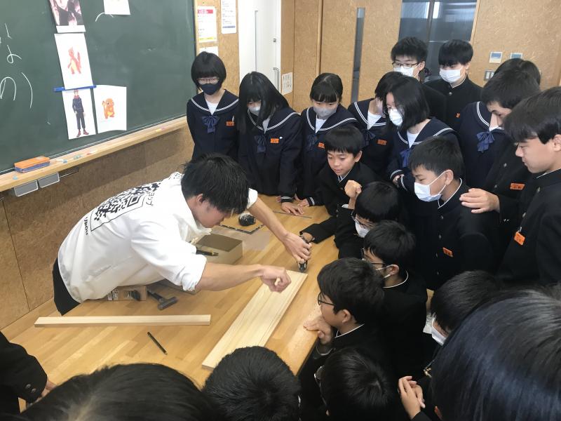 本日は、木工の学習に先駆けて、プロの職人さんから教えていただく貴重な機会となりました。授業の導入で、職人と素人の違いは?大工の三種の神器といわれるものは?など興味を引き出す様々な質問で、生徒たちを上手に授業に引き込みながら、楽しく授業を進めていただきました。後半には、金森さんによるのこぎり、金づち、かんなの使い方の実演がありました。生徒たちにとっては、使い方のポイントが明確になり、今後の本棚の製作に大いに役立つものと思います。