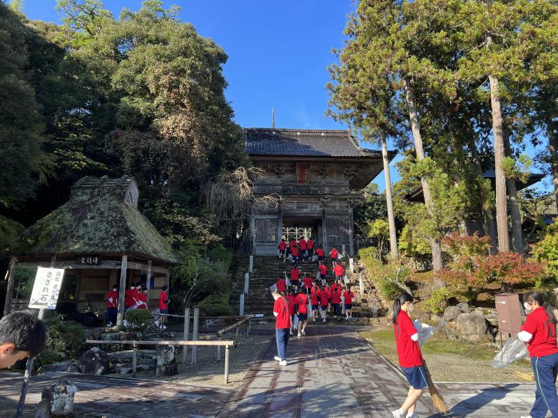 16日(木)、今年度のふるさと学習の一環として、3年3組の生徒が羽咋市の公式ユニフォームである「やる気満々!」ポロシャツを着て、妙成寺の境内の清掃活動を行いました。