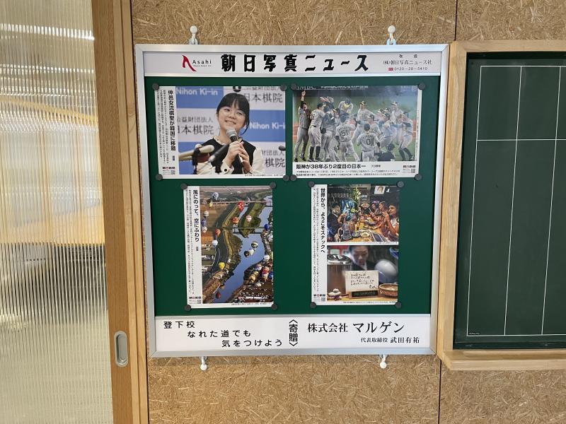 2階会議室前に設置した掲示板は、廊下を通る生徒たちが毎日目にすることができます。生徒たちは、1年を通して、写真資料でたくさんの情報を得ることができることを楽しみにしているものと思います。本当にありがとうございました。