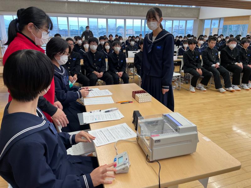 当日は、市の選挙管理委員会の3人の方々にご来校いただき、選挙の意義や選挙制度について説明をしていただきました。その後、事前に配布された羽咋市長選挙模擬選挙公報を参考に、2名の立候補者の公約を読み自分で判断して、実際に投票を行うというものです。また、選挙当日に必要な受付及び名簿対照係、投票用紙交付係、立会人などの係を生徒代表が担い、本当の選挙さながらの投票が行われました。