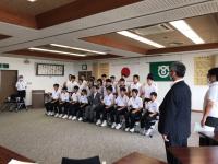邑知中学校の選手とともに総勢27人の生徒が、羽咋市役所を表敬訪問し、岸市長、八島教育長に県体の報告をしました。岸市長から激励の言葉をいただいた後、選手代表として、永原 秀悟さんが決意表明とお礼の言葉を述べました。