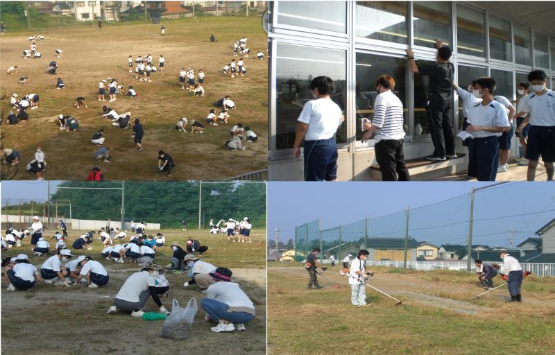 8/22(土) 7:00~8:00に親子ボランティアが行われました。当日は暑い日となりましたが、多くの保護者の方々と子どもたちに参加していただき、除草作業や窓ふきをしていただきました。その結果、雑草が生い茂っていたグラウンドは雑草部分が大幅に減り、子どもたちが思い切り体育や部活で汗を流すことができるようになりました。また、窓ふきのおかげで、気持ちよく学校生活を送ることができるようになりました。そして何よりも、強制でないにもかかわらず、休日の朝早くから学校に来て、ボランティア活動に勤しむ子どもたちの姿を見て、羽咋中の子どもたちの優しさ・頼もしさを改めて実感しました。保護者の皆さまに置かれましては、お忙しい中親子ボランティアに参加していただき、誠にありがとうございました。