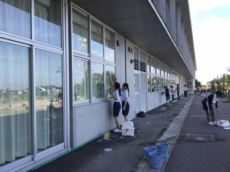 早朝から生徒、保護者の皆さんに来校していただき、教職員を合わせて約300名が1時間余りの活動に汗を流しました。グラウンドの除草、校舎の窓ふきなどを協力して行った後は、校舎内外は見違えるほどきれいになりました。