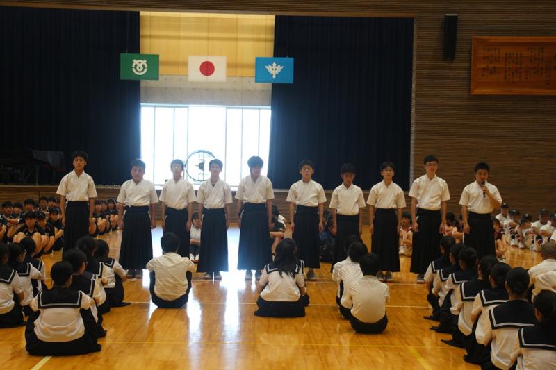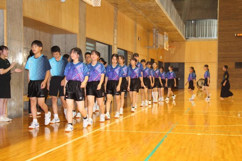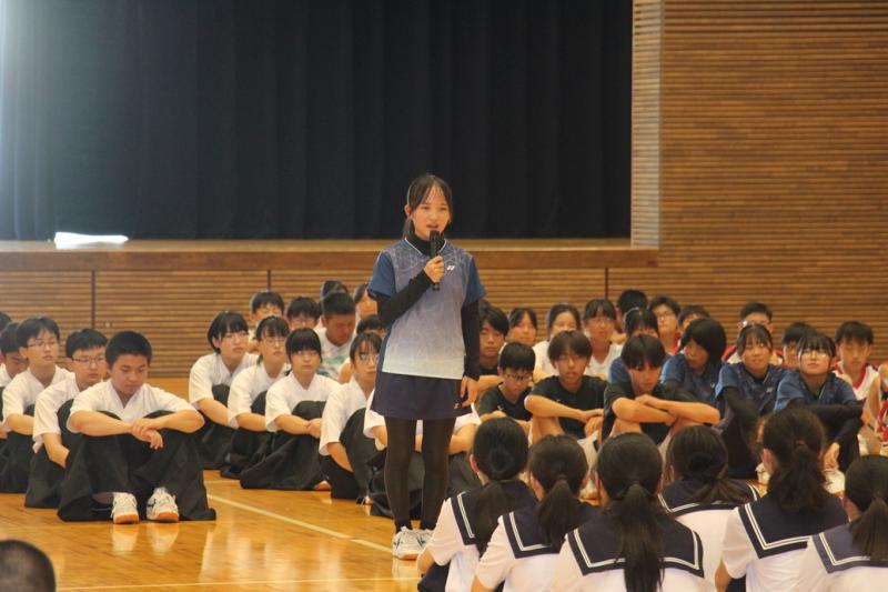 各部の部長による決意表明の後、生徒を代表して生徒会副会長の中村伊吹さんが激励の言葉を、そして、選手を代表して女子ソフトテニス部の道井さとかさんがお礼の言葉を述べました。