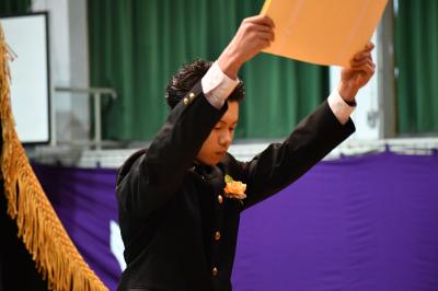 では。本校教職員の思いを代弁します。今日、本校を巣立つ皆さんの立派な姿を見て、とても誇らしく、教師冥利に尽きます。私達教職員は、皆さんが将来を逞しく生きることを願い、皆さんと向き合ってきました。時には、叱ったことがありましたが、これは愛情の裏返しです。私達は、卒業してからは、共に生きる人生の先輩です。