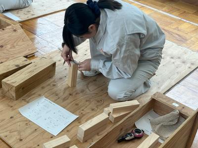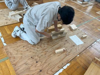 3年次は専門教科として「建築構造設計」「建築施工」「建築法規」「課題研究(総合的な探究の時間)」「実習(Ⅰ)」「実習(Ⅱ)」があります。「課題研究」では「設計」・「ものづくり」のグループに分かれて行っています。