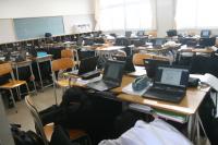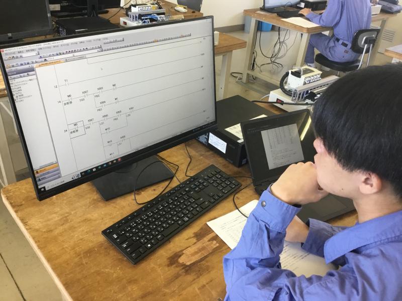 与えられた課題に合うようにラダー図を作成し、シーケンサにプログラムを送って正しく動作するかチェックしています。今回の検定試験では2年生5名、3年生7名の合計12名が受検します。
