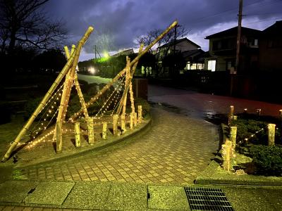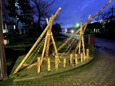 インターネットで調べた「竹あかり」を参考に、大きなモニュメントは雪吊りをイメージしています。