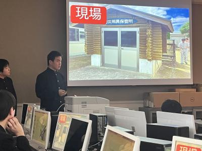 「みんなの地元で活躍する建設業を知ろう」と題して、地元建設業協会の方々と本校建設デザイン科の1・2年生が小グループに分かれて交換会を行いました。