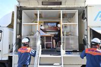 避難訓練後に本校の野球部員による「東日本大震災の被災支援事業に参加して」と題した発表を行い、羽咋市役所の「防災用具やグッズの展示・配給訓練」、羽咋消防署の「地震体験車」の体験なども行われました。