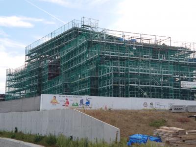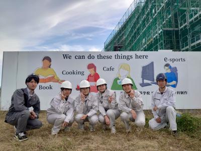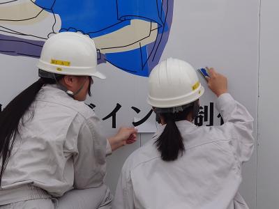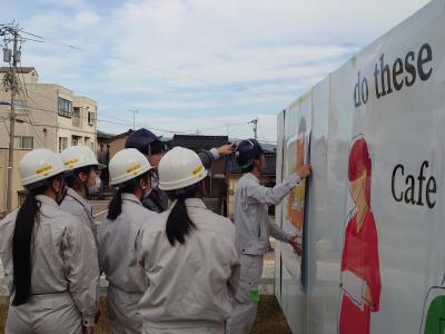 羽咋駅前に建設中のLakunaはくいの仮囲いに、建設・デザイン科の生徒がデザインしたアートの施工を行いました。