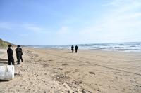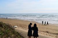 釜屋海岸で撮影している様子。歩きながらよさそうな写真が撮れる構図を検討しています。